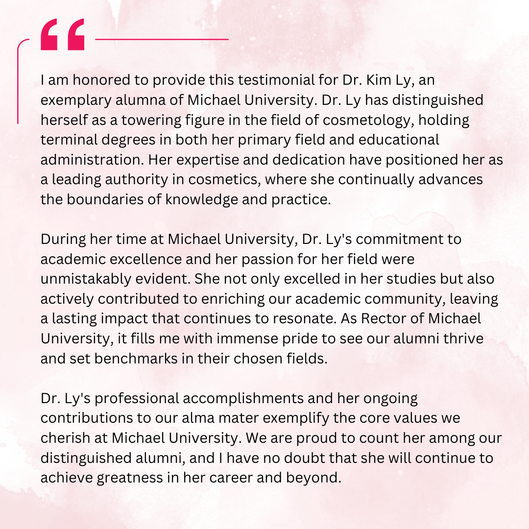 Today, Kim Ly has evolved from salon ownership to sharing her extensive knowledge as a Ph.D. professor at Michael University, teaching online courses in cosmetology and business management. Leveraging her multifaceted experience as a student, practitioner, business owner, teacher, and mentor, Kim now focuses on her new brand, offering invaluable education and mentorship to aspiring beauty industry entrepreneurs. Her journey, from immigrant to industry leader, positions her as an ideal guide for those seeking to establish and grow successful salon businesses.